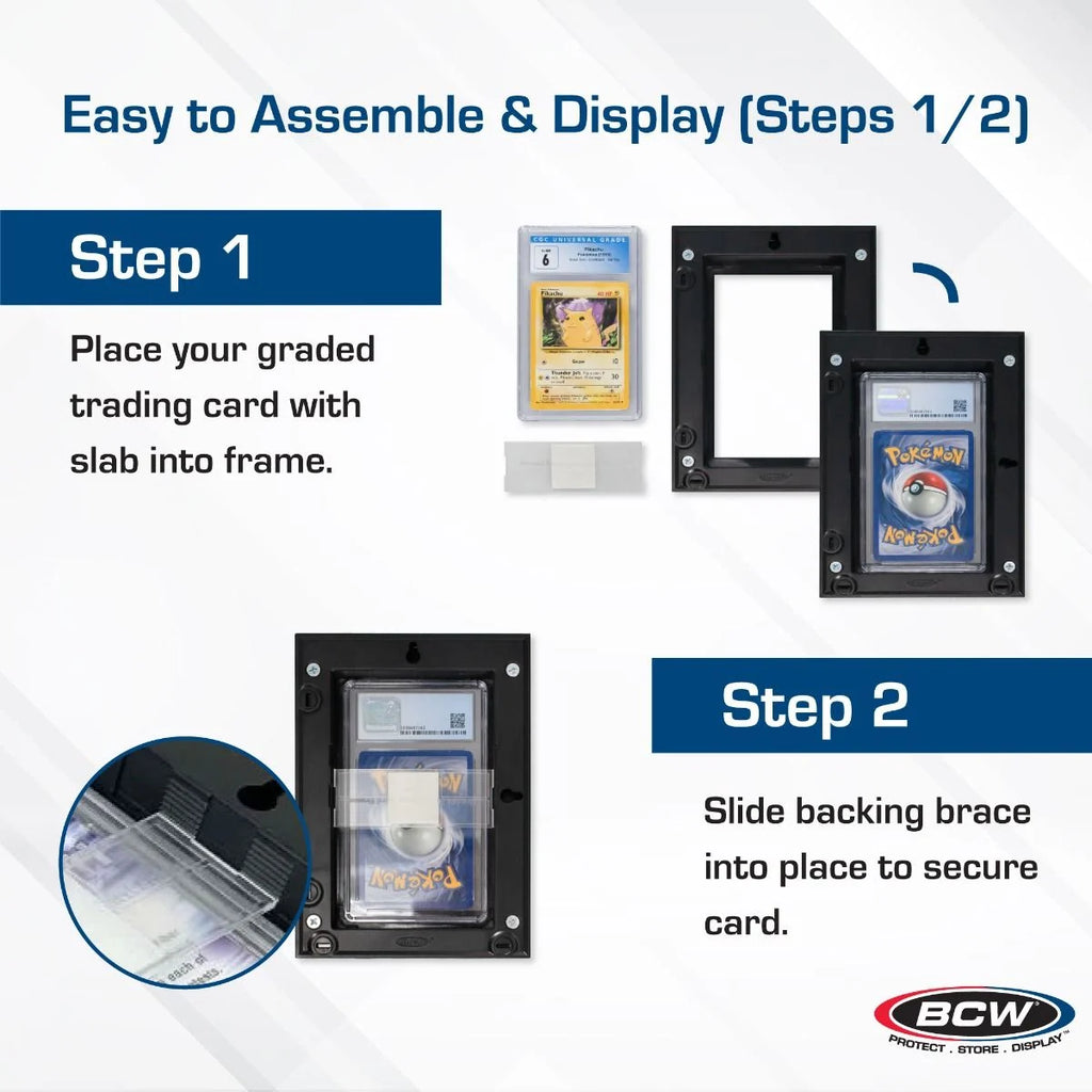The BCW Interlocking Graded Card Frames – Black offer a sleek and secure way to display your graded trading cards, combining premium design with customizable functionality. Each frame features a clean black border and is compatible with graded slabs from major grading services like PSA, BGS, SGC, CSG, and HGA, and others. The clear backing brace adjusts to accommodate varying slab thicknesses, holding your cards firmly in place while keeping them beautifully visible. Whether you're showcasing sports cards, Pokémon, Magic: The Gathering, or other collectible TCGs, these frames offer a polished and professional display option.