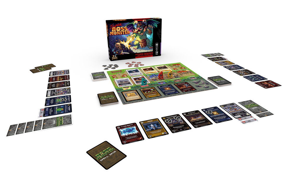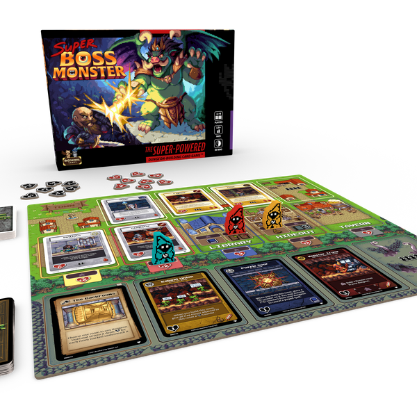 After a decade of dungeon-building fun, Boss Monster is leveling up to the next generation with Super Boss Monster! 1-4 players compete to build the ultimate side-scrolling dungeon by drafting room cards, playing spells, and luring in hapless adventurers.