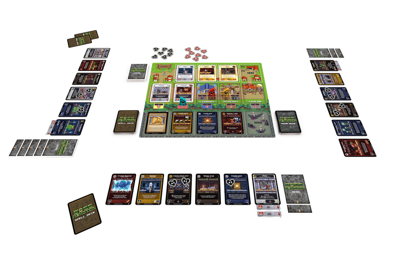 Super Boss Monster introduces the Town Board, which brings in new mechanics to the classic card game. Random room draws are replaced with a simple draft. Heroes still show up in town, but overflow into Locations (Temple, Stadium, Library, Hide-Out, and Tavern) where players can nab them with your all-new Minion meeple! If players choose to not use their Minion to direct a hero, Minions can activate other action spaces.