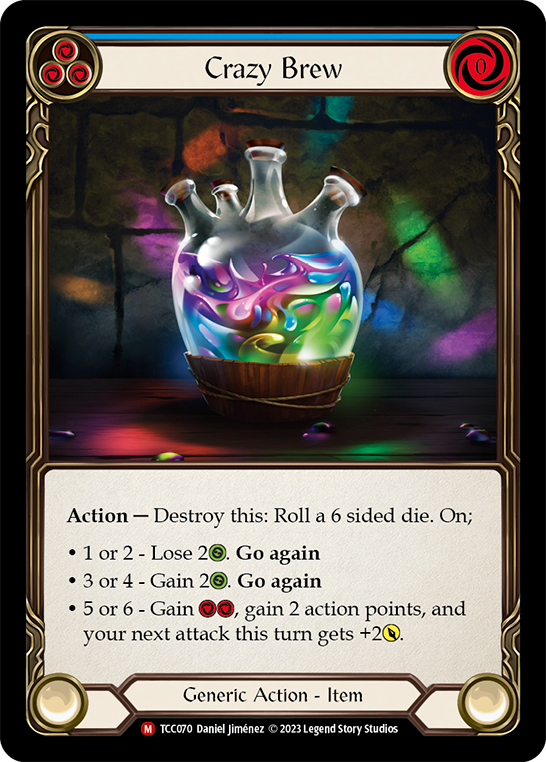 Action -- Destroy this: Roll a 6 sided die. On; 1 or 2 - Lose 2{g}. Go again 3 or 4 - Gain 2{g}. Go again 5 or 6 - Gain {r}{r}, gain 2 action points, and your next attack this turn gets +2{p}.