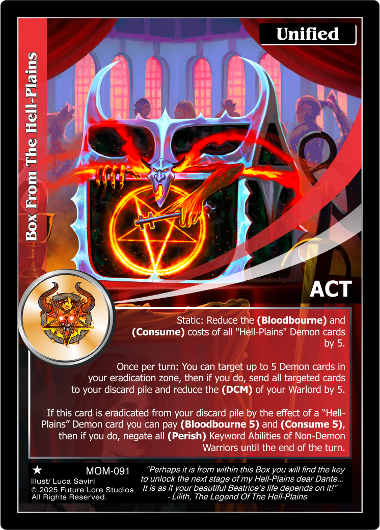 Static: Reduce the (Bloodbourne) and (Consume) costs of all “Hell-Plains” Demon cards by 5.