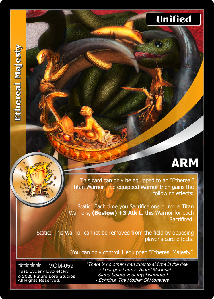 This card can only be equipped to an “Ethereal” Titan Warrior. The equipped Warrior then gains the following effects:
