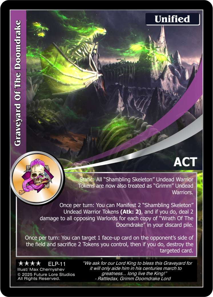 Once per turn: You can Manifest 2 “Shambling Skeleton” Undead Warrior Tokens (Atk: 2), and if you do, deal 2 damage to all opposing Warlords for each copy of “Wrath Of The Doomdrake” in your discard pile.