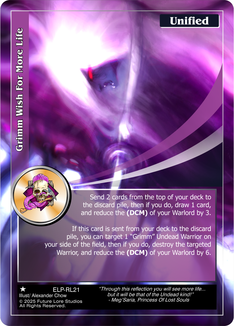 If this card is sent from your deck to the discard pile, you can target 1 “Grimm” Undead Warrior on your side of the field, then if you do, destroy the targeted Warrior, and reduce the (DCM) of your Warlord by 6.