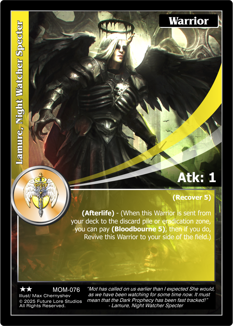 (Afterlife) – (When this Warrior is sent from your deck to the discard pile or eradication zone, you can pay (Bloodbourne 5), then if you do, Revive this Warrior to your side of the field.)