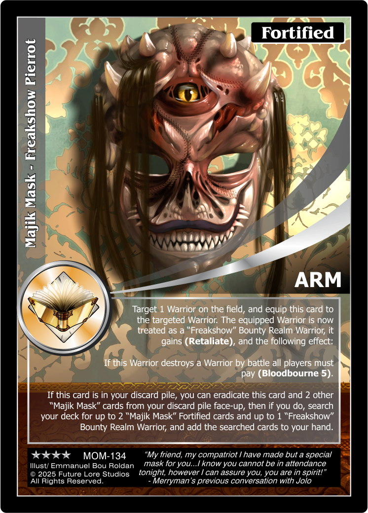 If this card is in your discard pile, you can eradicate this card and 2 other “Majik Mask” cards from your discard pile face-up, then if you do, search your deck for up to 2 “Majik Mask” Fortified cards and up to 1 “Freakshow” Bounty Realm Warrior, and add the searched cards to your hand.