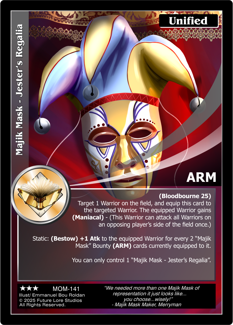 Static: (Bestow) +1 Atk to the equipped Warrior for every 2 “Majik Mask” Bounty (ARM) cards currently equipped to it.