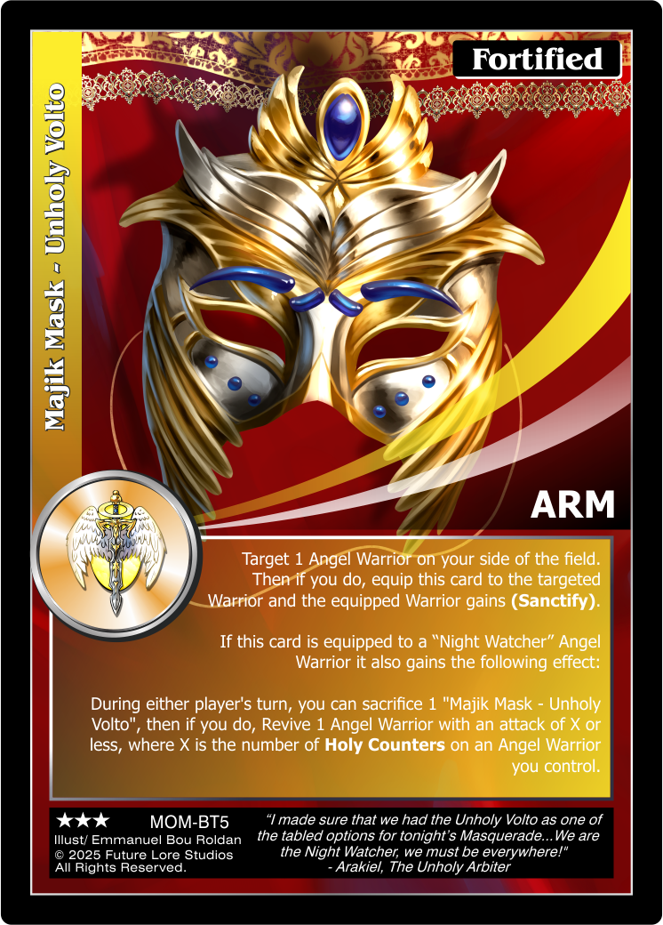 During either player's turn, you can sacrifice 1 "Majik Mask – Unholy Volto"; then if you do, Revive 1 Angel Warrior with an attack of X or less, where X is the number of Holy Counters on an Angel Warrior you control.