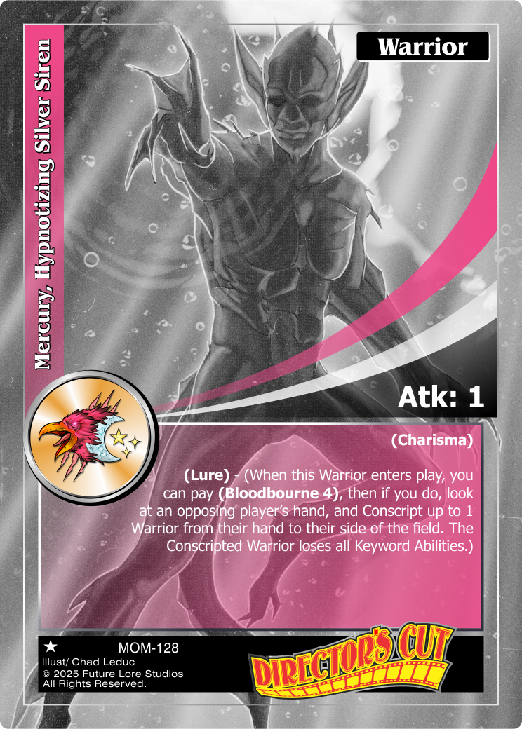 (Lure) – (When this Warrior enters play, you can pay (Bloodbourne 4), then if you do, look at an opposing player’s hand, and Conscript up to 1 Warrior from their hand to their side of the field. The Conscripted Warrior loses all Keyword Abilities.)