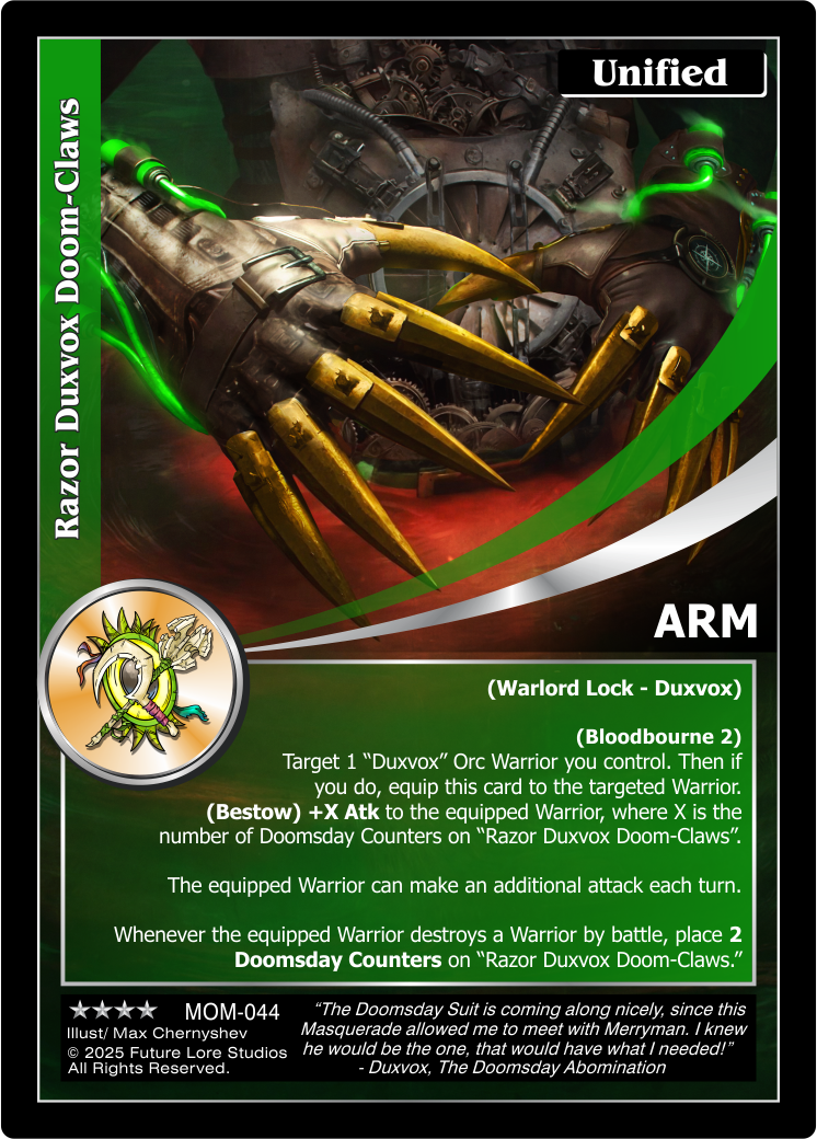 Whenever the equipped Warrior destroys a Warrior by battle, place 2 Doomsday Counters on “Razor Duxvox Doom-Claws.”