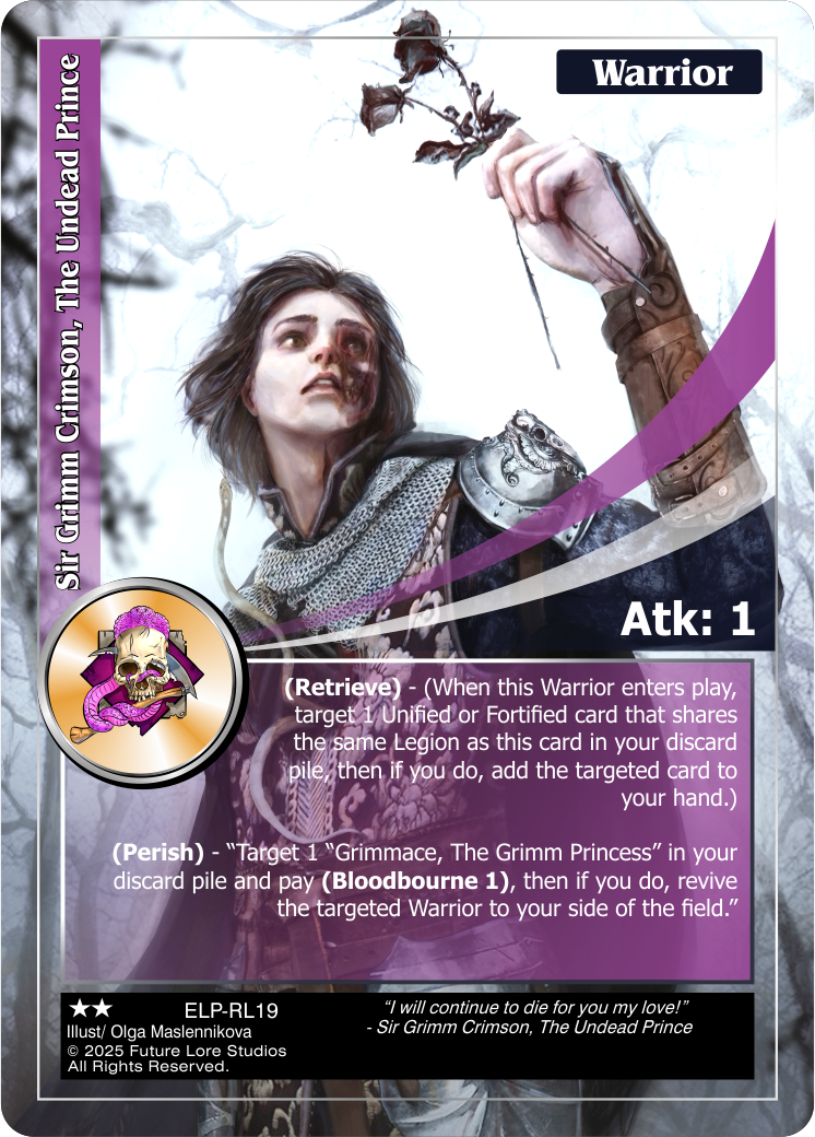 (Perish) – “Target 1 ‘Grimmace, The Grimm Princess’ in your discard pile and pay (Bloodbourne 1), then if you do, revive the targeted Warrior to your side of the field.”