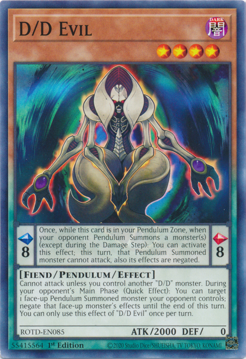 Cannot attack unless you control another "D/D" monster. During your opponent's Main Phase (Quick Effect): You can target 1 face-up Pendulum Summoned monster your opponent controls; negate that face-up monster's effects until the end of this turn. You can only use this effect of "D/D Evil" once per turn.