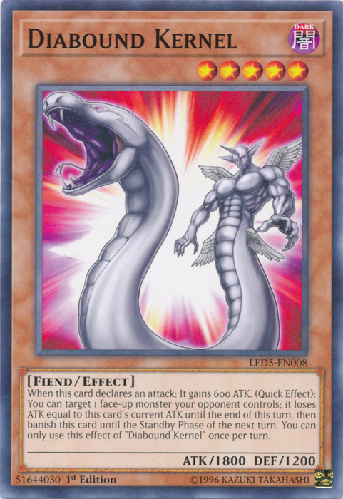 When this card declares an attack: It gains 600 ATK. (Quick Effect): You can target 1 face-up monster your opponent controls; Loses it ATK equal to this card's ATK current up to the end of this turn, Then banish this card up to the Standby Phase of the next turn. You can only use this effect of "Diabound Kernel" once per turn .