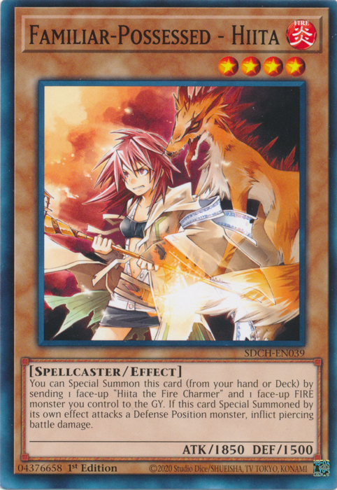 You can Special Summon this card (from your hand or your Deck) by sending 1 face-up "Hiita the Fire Charmer" and 1 face-up FIRE monster you control to the GY. If this card Special Summoned by its own effect attacks a Defense Position monster, inflict piercing battle damage.