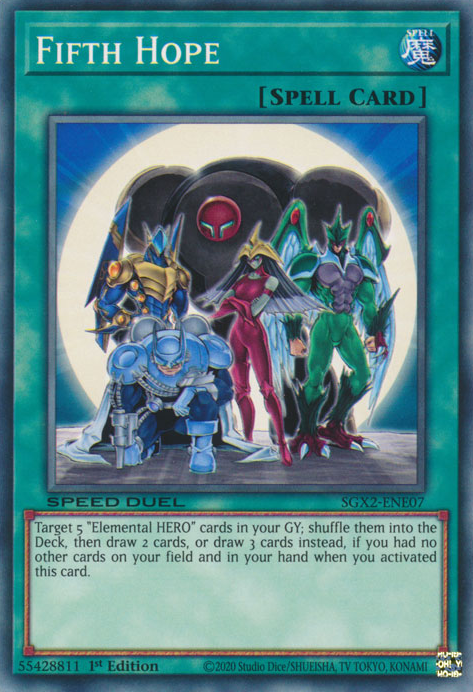 Target 5 "Elemental HERO" cards in your Graveyard; shuffle them into the Deck, then draw 2 cards (draw 3 cards instead, if you had no other cards on your side of the field and in your hand when you activated this card).