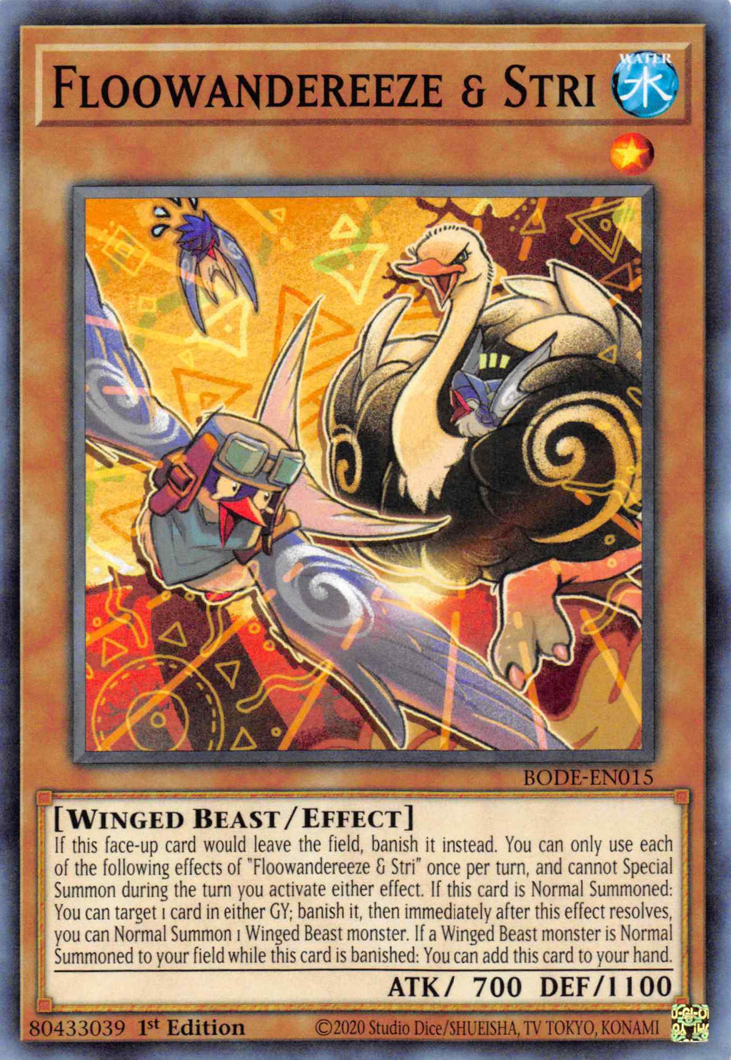 If this face-up card would leave the field, banish it instead. You can only use each of the following effects of "Floowandereeze & Stri" once per turn, and cannot Special Summon during the turn you activate either effect. If this card is Normal Summoned: You can target 1 card in either GY; banish it, then immediately after this effect resolves, you can Normal Summon 1 Winged Beast monster. If a Winged Beast monster is Normal Summoned to your field while this card is banished: You can add this card to your hand.