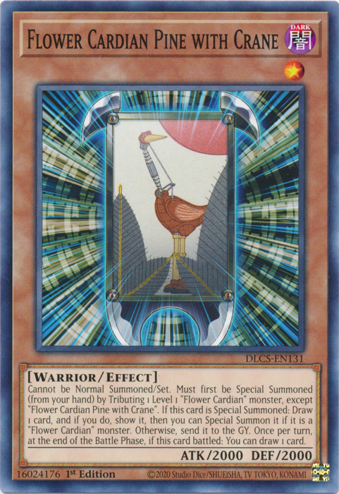 Cannot be Normal Summoned/Set. Must first be Special Summoned (from your hand) by Tributing 1 Level 1 "Flower Cardian" monster, except "Flower Cardian Pine with Crane". If this card is Special Summoned: Draw 1 card, and if you do, show it, then you can Special Summon it if it is a "Flower Cardian" monster. Otherwise, send it to the GY. Once per turn, at the end of the Battle Phase, if this card battled: You can draw 1 card.