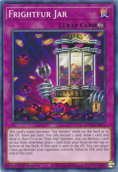 This card's name becomes "Toy Vendor" while on the field or in the GY. Once per turn: You can discard 1 card; draw 1 card and show it, then if it is an "Edge Imp" monster, you can destroy 1 card on the field, otherwise place 1 card from your hand on the top or bottom of the Deck. If this card is sent to the GY: You can target 1 face-up monster your opponent controls; halve its ATK until the end of this turn.