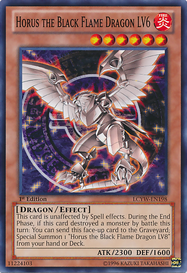 This card is unaffected by Spell effects. During the End Phase, if this card destroyed a monster by battle this turn: You can send this face-up card to the Graveyard; Special Summon 1 "Horus the Black Flame Dragon LV8" from your hand or Deck.