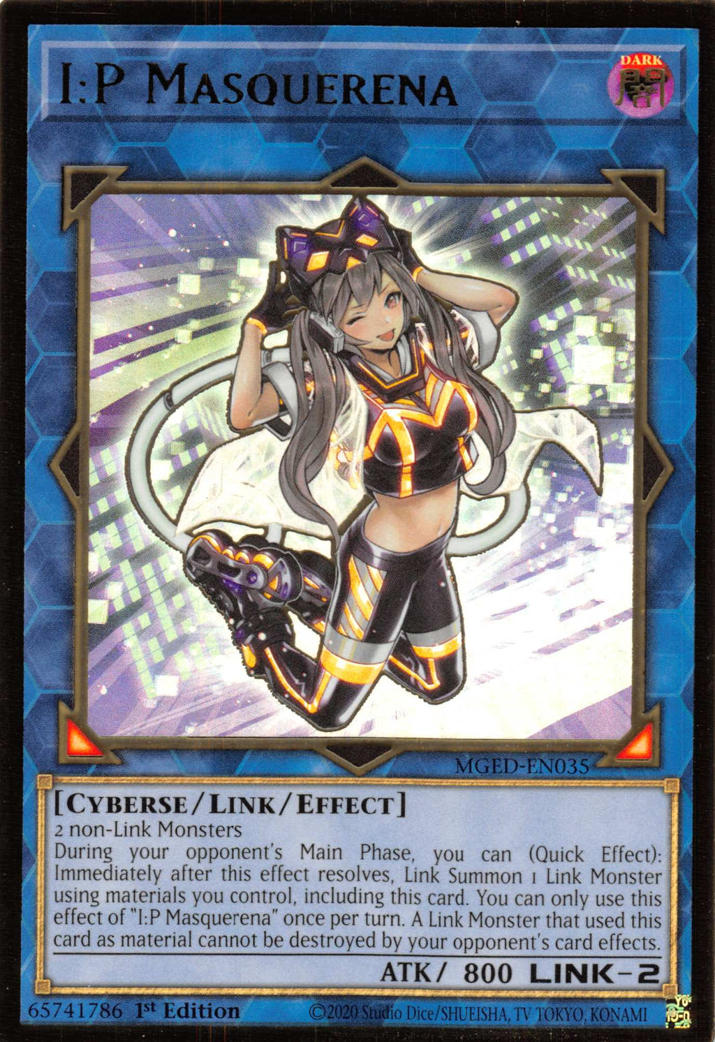 2 non-Link Monsters During your opponent's Main Phase, you can (Quick Effect): Immediately after this effect resolves, Link Summon 1 Link Monster using materials you control, including this card. You can only use this effect of "I:P Masquerena" once per turn. A Link Monster that used this card as material cannot be destroyed by your opponent's card effects.