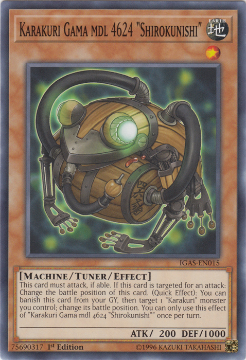 This card must attack, if able. If this card is targeted for an attack: Change the battle position of this card. (Quick Effect): You can banish this card from your GY, then target 1 "Karakuri" monster you control; change its battle position. You can only use this effect of "Karakuri Gama mdl 4624 "Shirokunishi"" once per turn.