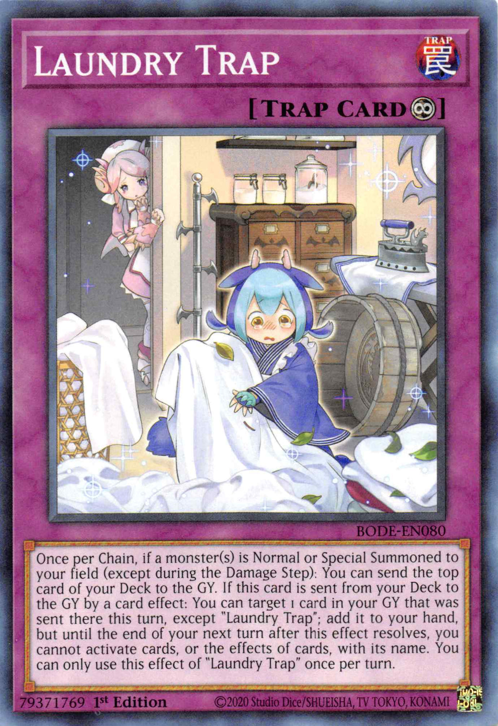 Once per Chain, if a monster(s) is Normal or Special Summoned to your field (except during the Damage Step): You can send the top card of your Deck to the GY. If this card is sent from your Deck to the GY by a card effect: You can target 1 card in your GY that was sent there this turn, except "Laundry Trap"; add it to your hand, but until the end of your next turn after this effect resolves, you cannot activate cards, or the effects of cards, with its name. You can only use this effect of "Laundry Trap" once per turn.