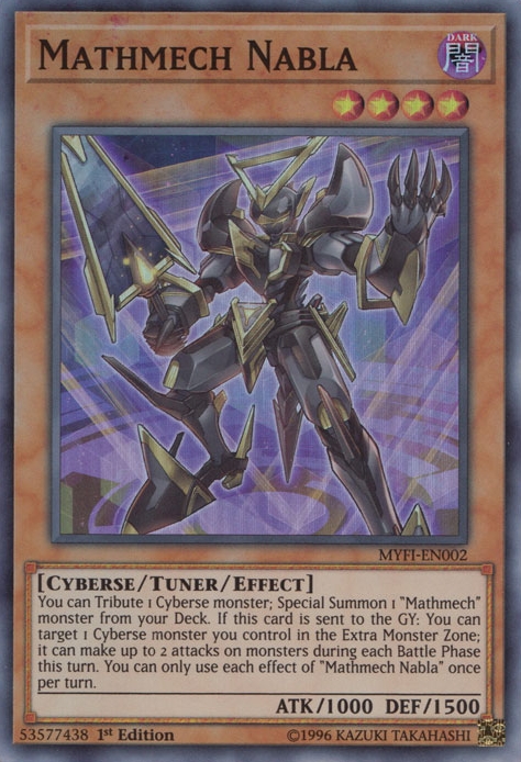 You can Tribute 1 Cyberse monster; Special Summon 1 "Mathmech" monster from your Deck. If this card is sent to the GY: You can target 1 Cyberse monster you control in the Extra Monster Zone; it can make up to 2 attacks on monsters during each Battle Phase this turn. You can only use each effect of "Mathmech Nabla" once per turn.