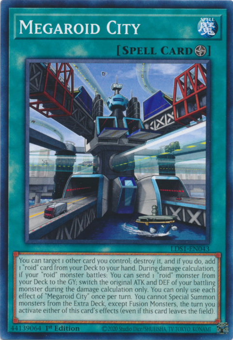 You can target 1 other card you control; destroy it, and if you do, add 1 "roid" card from your Deck to your hand. During damage calculation, if your "roid" monster battles: You can send 1 "roid" monster from your Deck to the GY; switch the original ATK and DEF of your battling monster during the damage calculation only. You can only use each effect of "Megaroid City" once per turn. You cannot Special Summon monsters from the Extra Deck, except Fusion Monsters, the turn you activate either of this card's effects (even if this card leaves the field).