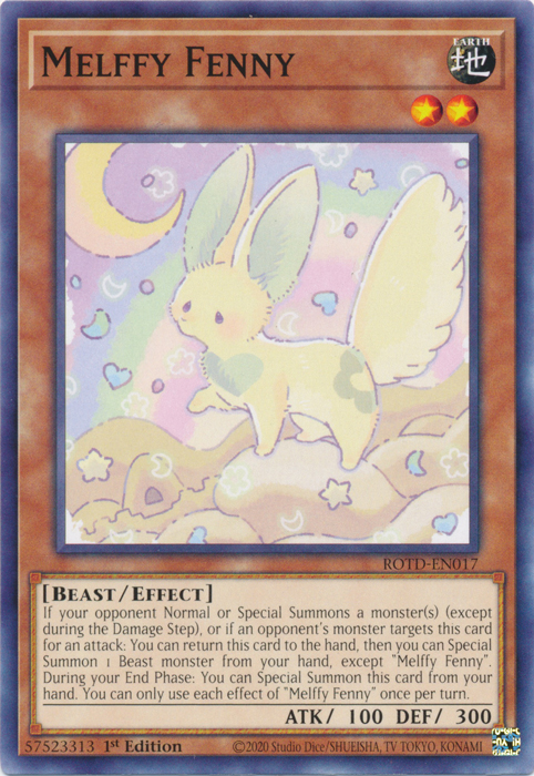 If your opponent Normal or Special Summons a monster(s) (except during the Damage Step), or if an opponent's monster targets this card for an attack: You can return this card to the hand, then you can Special Summon 1 Beast monster from your hand, except "Melffy Fenny". During your End Phase: You can Special Summon this card from your hand. You can only use each effect of "Melffy Fenny" once per turn.