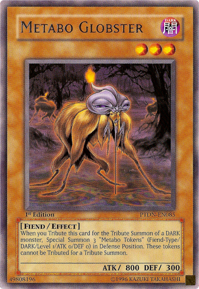 When you Tribute this card for the Tribute Summon of a DARK monster, Special Summon 3 "Metabo Tokens" (Fiend-Type/DARK/Level 1/ATK 0/DEF 0) in Defense Position. These Tokens cannot be Tributed for a Tribute Summon.