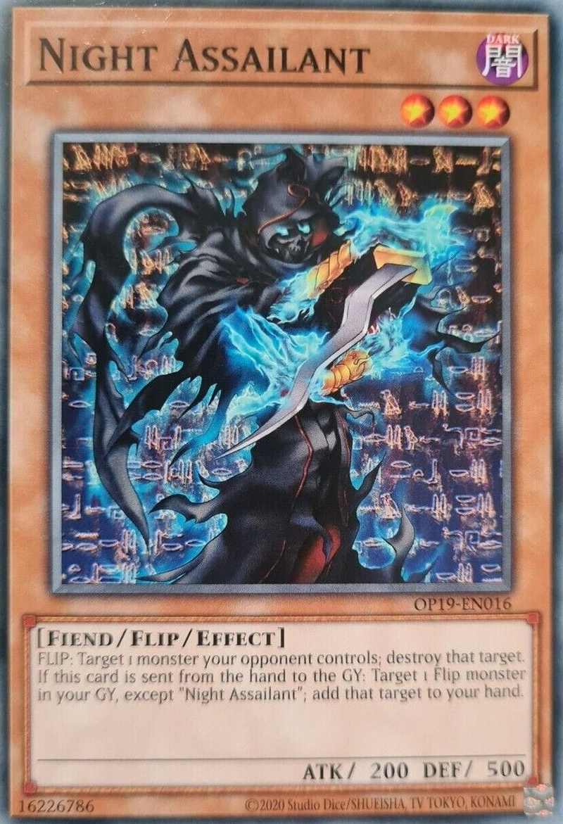 If this card is sent from the hand to the GY: Target 1 Flip monster in your GY, except "Night Assailant"; add that target to your hand.