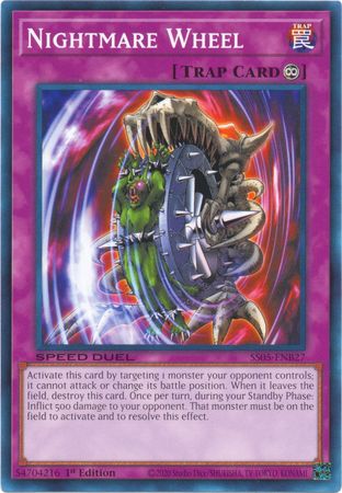 Activate this card by targeting 1 monster your opponent controls; it cannot attack or change its battle position. When it leaves the field, destroy this card. Once per turn, during your Standby Phases: Inflict 500 damage to your opponent. That monster must be on the field to activate and to resolve this effect.
