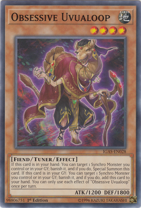 If this card is in your hand: You can target 1 Synchro Monster you control or in your GY; banish it, and if you do, Special Summon this card. If this card is in your GY: You can target 1 Synchro Monster you control or in your GY; banish it, and if you do, add this card to your hand. You can only use each effect of "Obsessive Uvualoop" once per turn.
