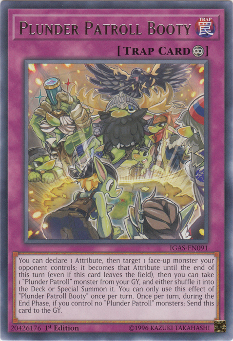 You can declare 1 Attribute, then target 1 face-up monster your opponent controls; it becomes that Attribute until the end of this turn (even if this card leaves the field), then you can take 1 "Plunder Patroll" monster from your GY, and either shuffle it into the Deck or Special Summon it. You can only use this effect of "Plunder Patroll Booty" once per turn. Once per turn, during the End Phase, if you control no "Plunder Patroll" monsters: Send this card to the GY.