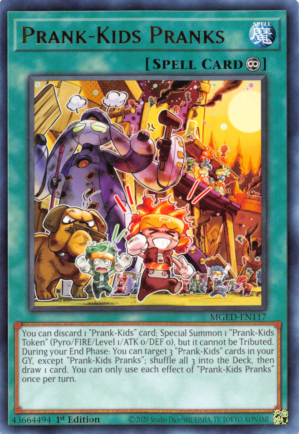 You can discard 1 "Prank-Kids" card; Special Summon 1 "Prank-Kids Token" (Pyro/FIRE/Level 1/ATK 0/DEF 0), but it cannot be Tributed. During your End Phase: You can target 3 "Prank-Kids" cards in your GY, except "Prank-Kids Pranks"; shuffle all 3 into the Deck, then draw 1 card. You can only use each effect of "Prank-Kids Pranks" once per turn.