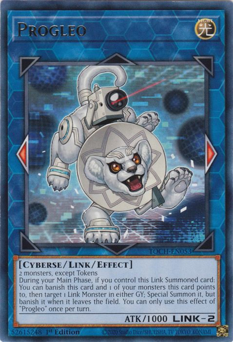 2 monsters, except Tokens During your Main Phase, if you control this Link Summoned card: You can banish this card and 1 of your monsters this card points to, then target 1 Link Monster in either GY; Special Summon it, but banish it when it leaves the field. You can only use this effect of "Progleo" once per turn.