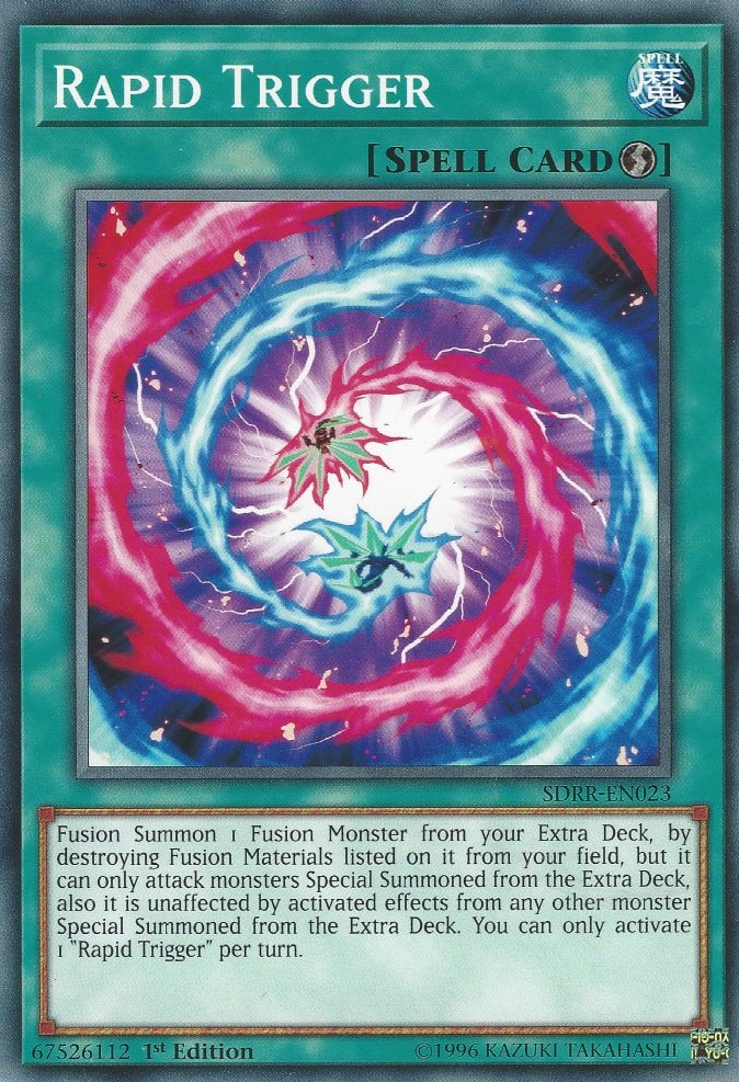 Fusion Summon 1 Fusion Monster from your Extra Deck, by destroying Fusion Materials listed on it from your field, but it can only attack monsters Special Summoned from the Extra Deck, also it is unaffected by activated effects from any other monster Special Summoned from the Extra Deck. You can only activate 1 "Rapid Trigger" per turn.