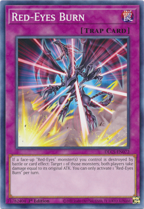 If a face-up "Red-Eyes" monster(s) you control is destroyed by battle or card effect: Target 1 of those monsters; both players take damage equal to its original ATK. You can only activate 1 "Red-Eyes Burn" per turn.