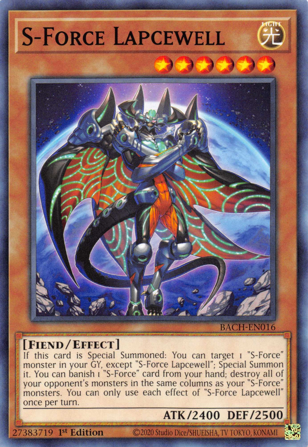 If this card is Special Summoned: You can target 1 "S-Force" monster in your GY, except "S-Force Lapcewell"; Special Summon it. You can banish 1 "S-Force" card from your hand; destroy all of your opponent's monsters in the same columns as your "S-Force" monsters. You can only use each effect of "S-Force Lapcewell" once per turn.