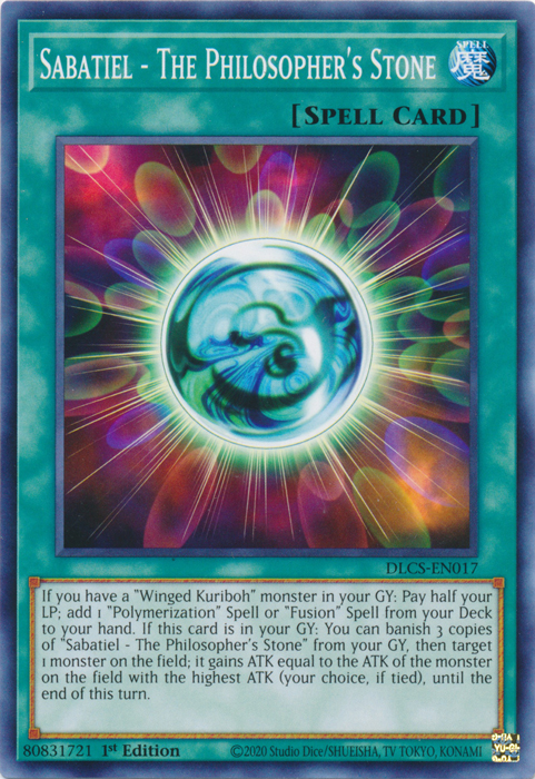 If you have a "Winged Kuriboh" monster in your GY: Pay half your LP; add 1 "Polymerization" Spell or "Fusion" Spell from your Deck to your hand. If this card is in your GY: You can banish 3 copies of "Sabatiel - The Philosopher's Stone" from your GY, then target 1 monster on the field; it gains ATK equal to the ATK of the monster on the field with the highest ATK (your choice, if tied), until the end of this turn.