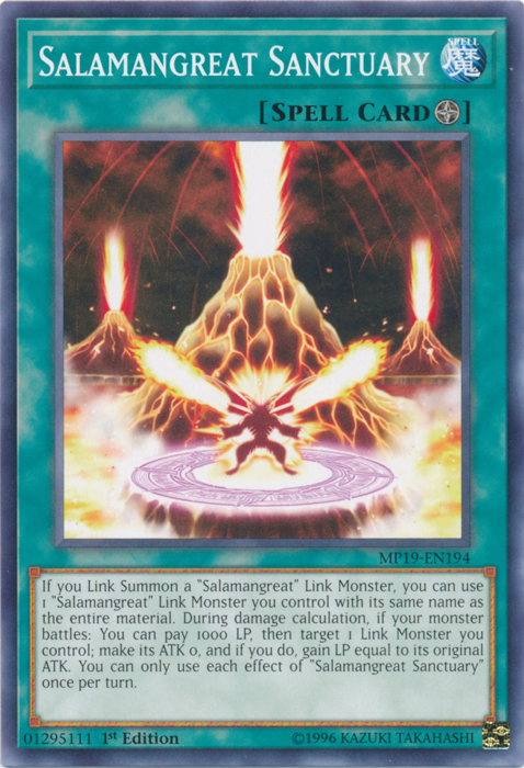 If you Link Summon a "Salamangreat" Link Monster, you can use 1 "Salamangreat" Link Monster you control with its same name as the entire material. During damage calculation, if your monster battles: You can pay 1000 LP, then target 1 Link Monster you control; make its ATK 0, and if you do, gain LP equal to its original ATK. You can only use each effect of "Salamangreat Sanctuary" once per turn.