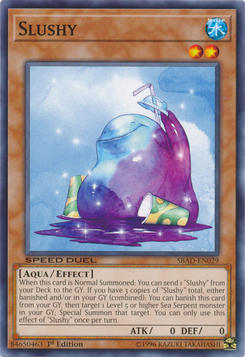 When this card is Normal Summoned: You can send 1 "Slushy" from your Deck to the GY. If you have 3 copies of "Slushy" total, either banished and/or in your GY (combined): You can banish this card from your GY, then target 1 Level 5 or higher Sea Serpent monster in your GY; Special Summon that target. You can only use this effect of "Slushy" once per turn.