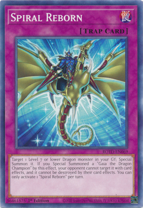 Target 1 Level 7 or lower Dragon monster in your GY; Special Summon it. If you Special Summoned a "Gaia the Dragon Champion" by this effect, your opponent cannot target it with card effects, and it cannot be destroyed by their card effects. You can only activate 1 "Spiral Reborn" per turn.