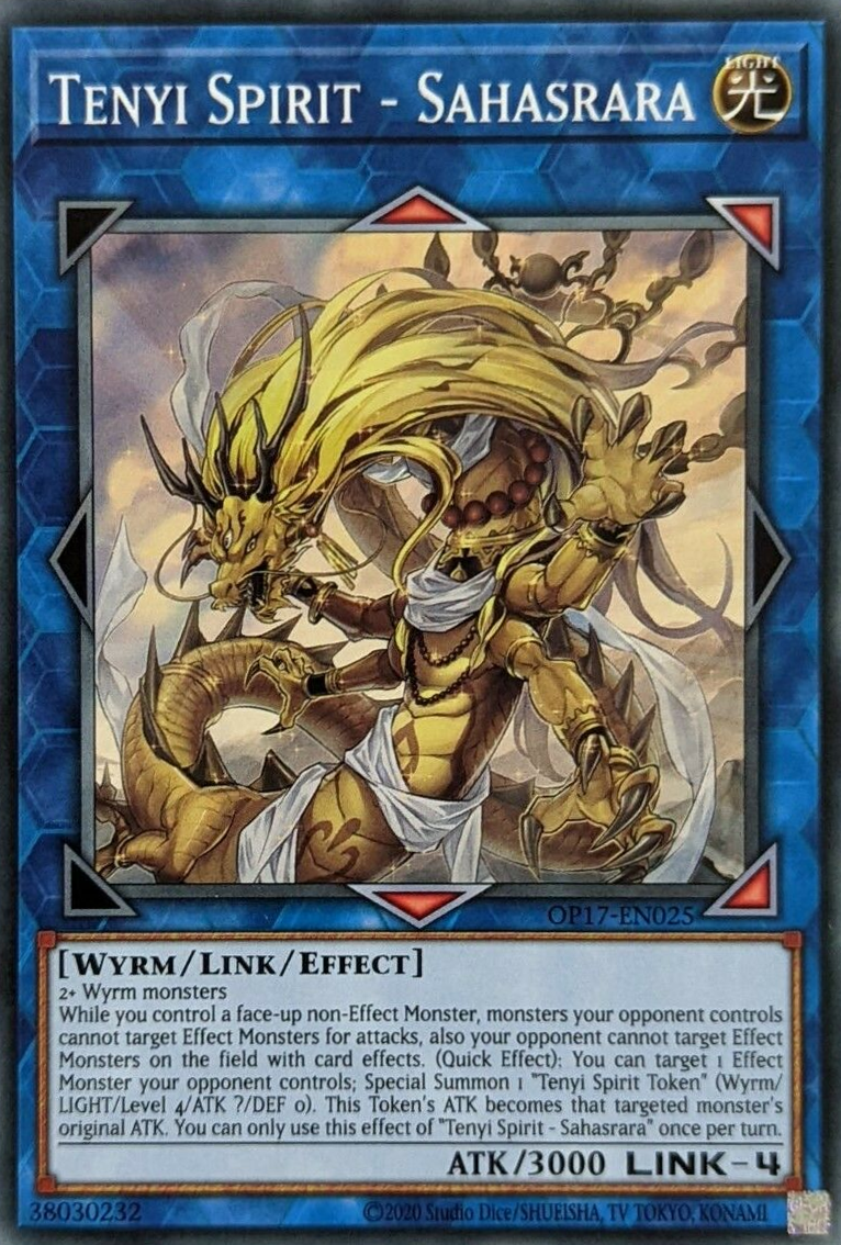 While you control a face-up non-Effect Monster, monsters your opponent controls cannot target Effect Monsters for attacks, also your opponent cannot target Effect Monsters on the field with card effects. (Quick Effect): You can target 1 Effect Monster your opponent controls; Special Summon 1 "Tenyi Spirit Token" (Wyrm/LIGHT/Level 4/ATK ?/DEF 0). This Token's ATK becomes that targeted monster's original ATK. You can only use this effect of "Tenyi Spirit - Sahasrara" once per turn.