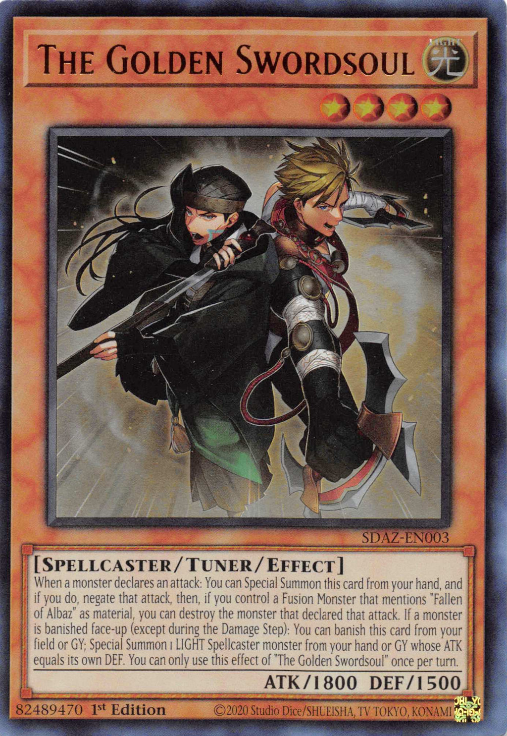 When a monster declares an attack: You can Special Summon this card from your hand, and if you do, negate that attack, then, if you control a Fusion Monster that mentions "Fallen of Albaz" as material, you can destroy the monster that declared that attack. If a monster is banished face-up (except during the Damage Step): You can banish this card from your field or GY; Special Summon 1 LIGHT Spellcaster monster from your hand or GY whose ATK equals its own DEF. You can only use this effect of "The Golden Swordsoul" once per turn.