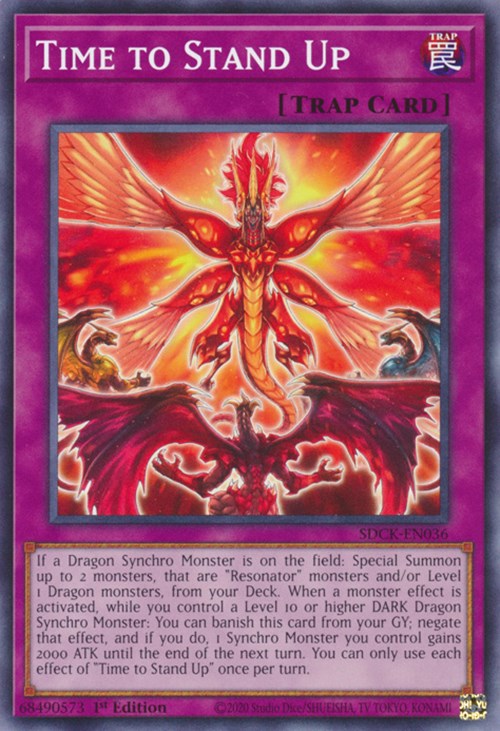 If a Dragon Synchro Monster is on the field: Special Summon up to 2 monsters, that are "Resonator" monsters and/or Level 1 Dragon monsters, from your Deck. When a monster effect is activated, while you control a Level 10 or higher DARK Dragon Synchro Monster: You can banish this card from your GY; negate that effect, and if you do, 1 Synchro Monster you control gains 2000 ATK until the end of the next turn. You can only use each effect of "Time to Stand Up" once per turn.