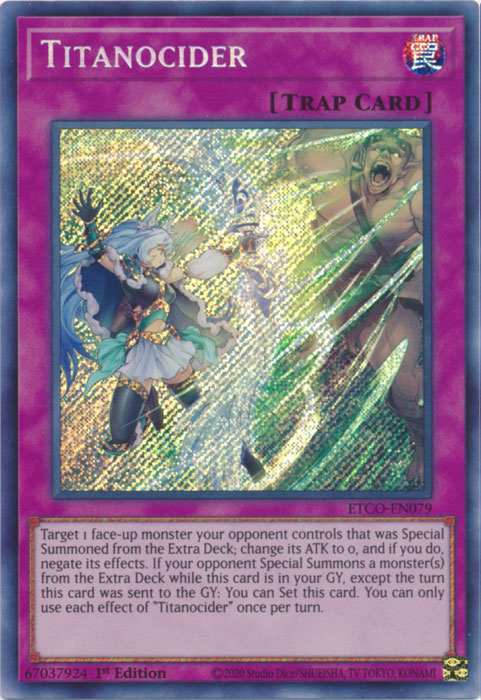 Target 1 face-up monster your opponent controls that was Special Summoned from the Extra Deck; change its ATK to 0, and if you do, negate its effects. If your opponent Special Summons a monster(s) from the Extra Deck while this card is in your GY, except the turn this card was sent to the GY: You can Set this card. You can only use each effect of "Titanocider" once per turn.