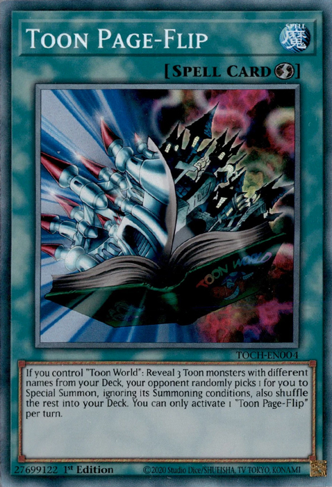 If you control "Toon World": Reveal 3 Toon monsters with different names from your Deck, your opponent randomly picks 1 for you to Special Summon, ignoring its Summoning conditions, also shuffle the rest into your Deck. You can only activate 1 "Toon Page-Flip" per turn.