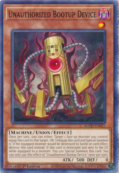 Once per turn, you can either: Target 1 face-up monster you control; equip this card to that target, OR: Unequip this card and Special Summon it. If the equipped monster would be destroyed by battle or card effect, destroy this card instead. If this card is destroyed and sent to the GY while equipped to a monster: You can Special Summon this card. You can only use this effect of "Unauthorized Bootup Device" once per turn.