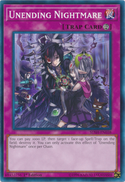 You can pay 1000 LP, then target 1 face-up Spell/Trap on the field; destroy it. You can only activate this effect of "Unending Nightmare" once per Chain.